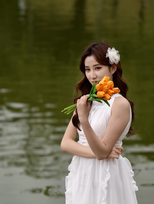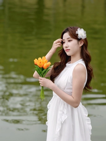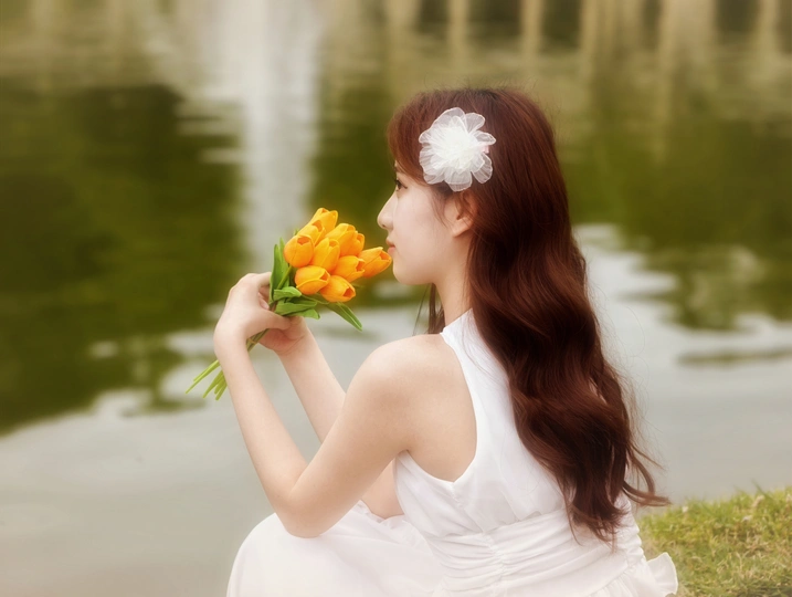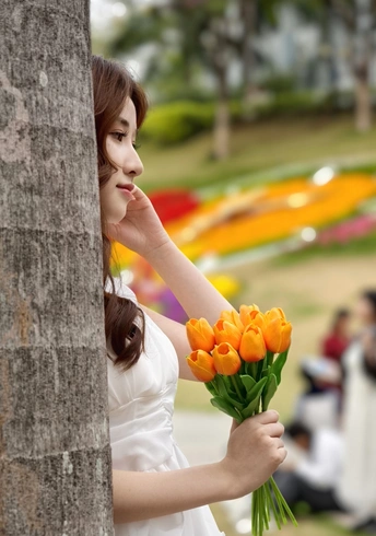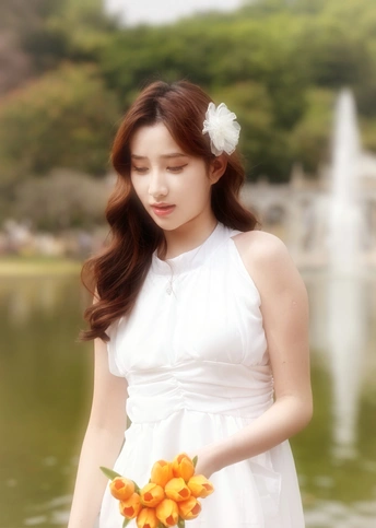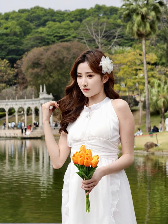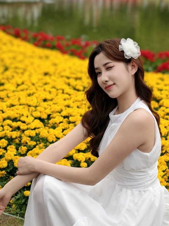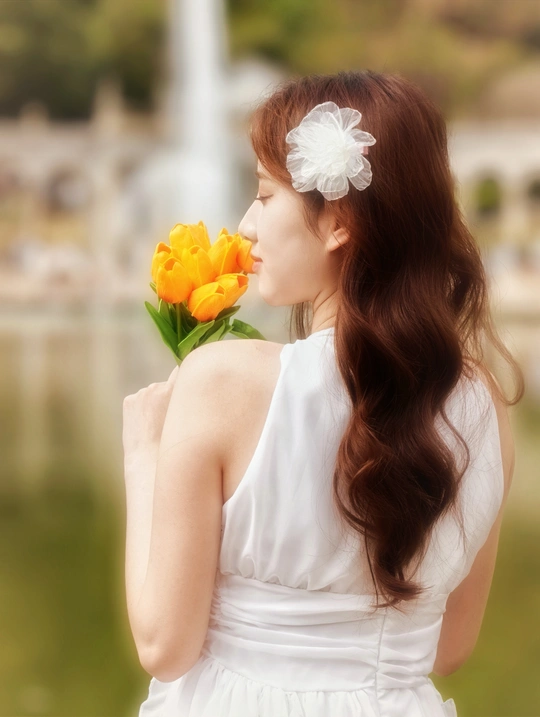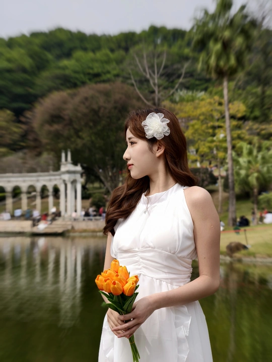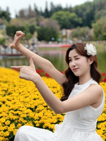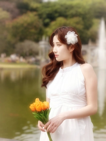 在繁花簇拥的世界里,她身着一袭白裙,宛如落入人间的仙子。于金黄花海中展露笑颜,手持明艳花束,姿态优雅。周围的绿植、喷泉与花朵,皆成为衬托她美丽的背景 。每一个瞬间,都被镜头定格,诉说着专属于春日的浪漫与温柔 。