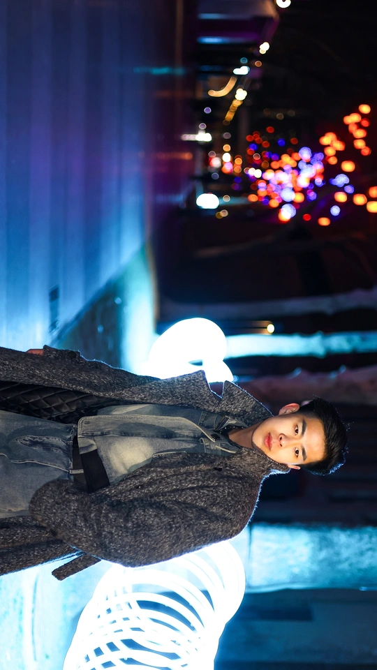 偶遇在798艺术区,抓拍了几张氛围感的夜景人像。
