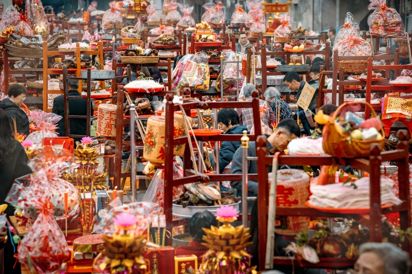 在潮汕的传统拜神现场,香火缭绕,供品摆满了桌子,一片庄严而热烈的氛围。这里的人们虔诚地祭拜,表达着对神明的敬畏与感恩。每一份心意,都融入了这片土地深厚的文化与信仰。