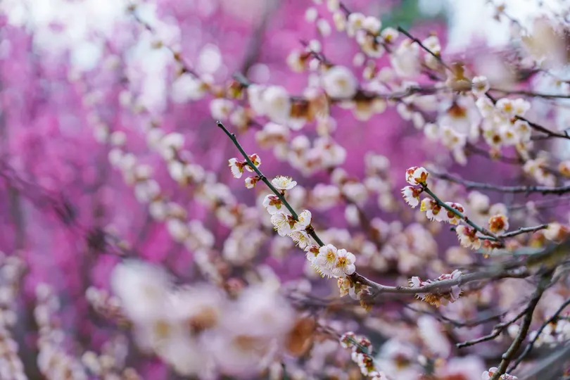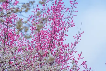 植物园红色和白色的山樱花相互映衬着很漂亮