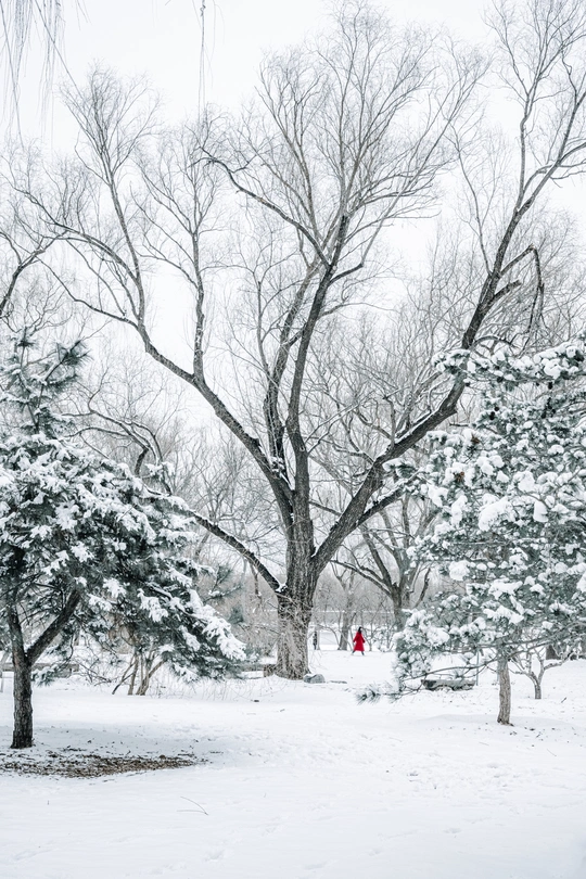 冬日,冬雪。银装素裹的大地,一树洁白,红装骤现。