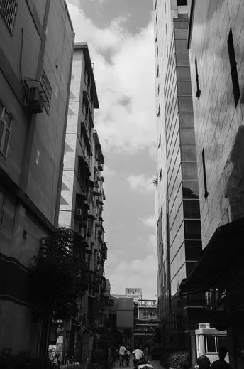这张黑白照片展示了城市建筑间的狭窄空间,颇具视觉冲击力。我们来具体看看: * **色彩:** 由于是黑白照片,色彩分析就变成了对灰阶的评估。整体灰阶过渡较为平滑,但部分区域对比度可以更强,突出建筑的肌理和层次感。 * **光影:** 光线较为均匀,缺乏戏剧性的光影效果。高楼大厦间的漫射光使画面略显平淡。可以尝试在不同天气或时间段拍摄,捕捉更具表现力的光影。 * **构图:** 纵深感构图不错,引导视线向远处延伸。建筑的线条汇聚于一点,增强了空间感。但是,画面稍显拥挤,可以尝试略微调整拍摄角度,使天空的比例增加,呼吸感会更好。 * **后期处理:** 后期处理比较到位,转换为黑白,并适当调整了对比度。可以尝试局部调整,例如提亮天空,压暗建筑阴影,以增强层次感。 * **主题原创性:** 拍摄城市建筑的缝隙空间,视角较为常见,但照片中行人的出现增添了一丝生活气息。 * **情感共鸣:** 黑白影调容易引发怀旧、沉静的情绪。但由于光影较为平淡,情感表达略显不足。 * **思想深度:** 照片反映了城市化进程中高密度建筑的现状,以及人在其中的渺小感。