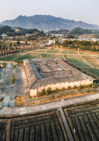 客家围屋与远处高山