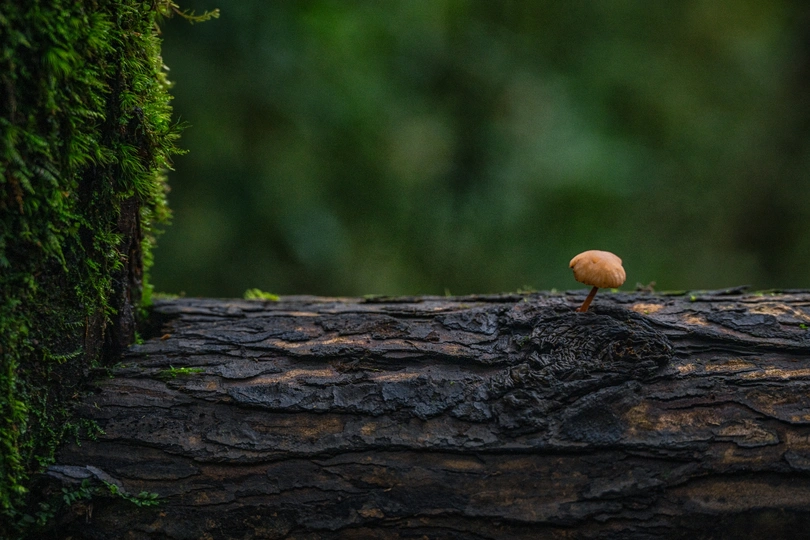 一段饱经岁月的粗糙树皮上,一抹亮眼的橙色悄然探出头,它静静伫立,仿佛是从时光缝隙中蹦出的小精灵。旁边,翠绿的苔藓肆意蔓延,与暗色的枯木、橙黄的蘑菇相映成趣。这里静谧又充满生机