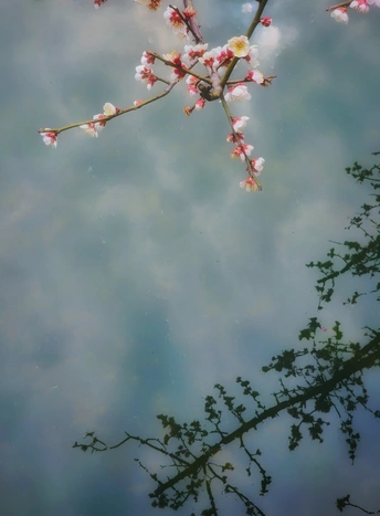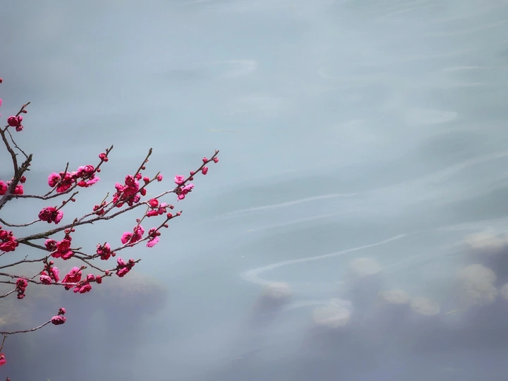 梅花映水,这一摄影角度独具匠心,将自然之美与摄影艺术巧妙融合。梅花以其傲骨凌霜之姿,倒映在清澈的水面上,形成了一幅静谧而深远的画面。这样的构图不仅捕捉到了梅花的神韵,还通过水面的倒影,增添了一份朦胧与梦幻。