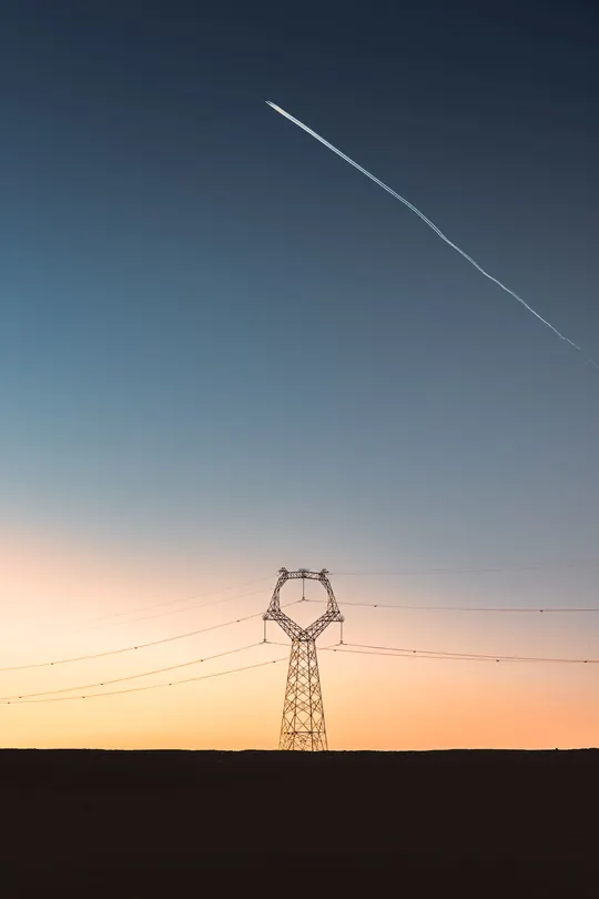 大西北的戈壁滩里,方圆百公里别无他物,唯有输电塔、风力电机等一系列基础能源设施,一架飞机从纯净的天空掠过,留下长长的尾翼气流,与高压输电塔同框出现。