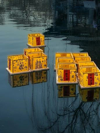蓝调时间的五龙潭景区,拍摄了水面上的许愿灯,表现了冷暖色的对比和人们的祈福祝愿。