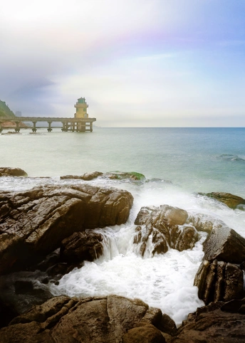 早上水汽大、太阳透过水汽出现了彩虹、早上的海水汹涌的咆哮着。