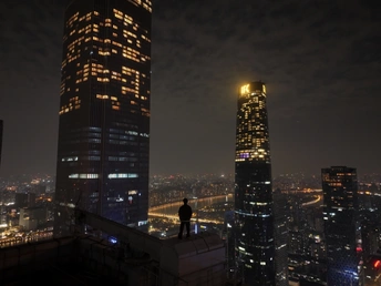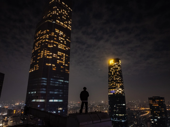 双关无人机悬停拍摄与人物身处高处的临界状态