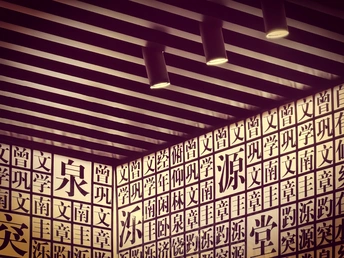 在大明湖的超然楼,拍摄了里面展区的汉字,屋顶设计和光影,表现了汉字和线条及美。