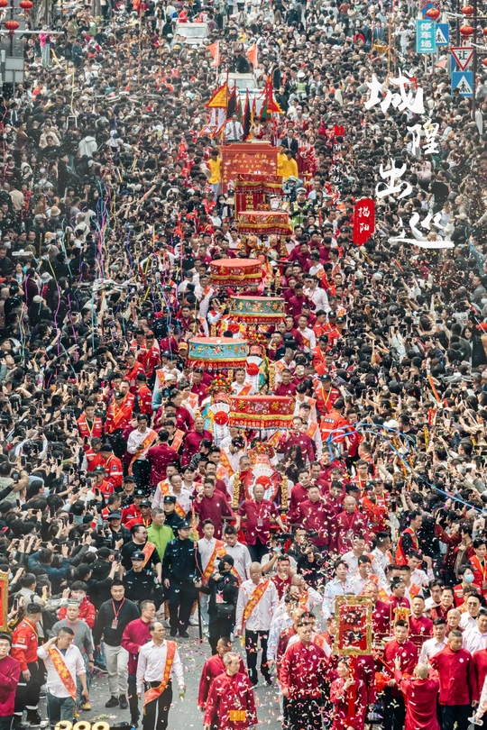 人潮汹涌,欢腾四起。这场庙会巡游,承载着传统的神圣与热烈,彩带飞扬,锣鼓喧天,神像庄严安坐。成群的群众簇拥着,脸上洋溢着虔诚与兴奋,一步步将祝福传递到每一位信众的心中。