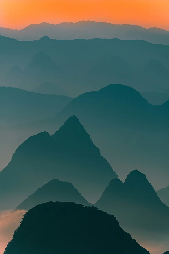在群山层叠,在光影晕染下,呈现出深浅不一的色调,远山的山峦在暮色中若隐若现,仿佛蒙上一层轻柔的薄纱,惊现大自然的静谧与悠远。