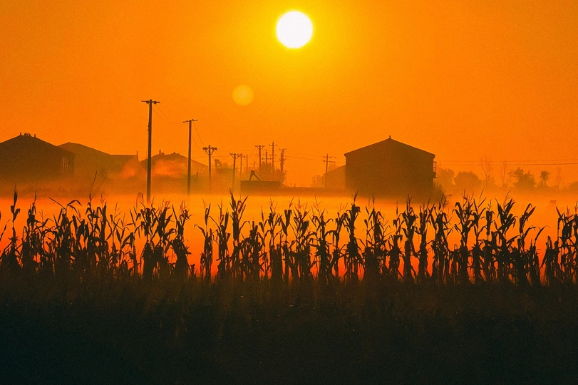 晨曦中,橙黄的阳光洒向大地,玉米地在薄雾里若隐若现,远处的房屋和电线杆勾勒出宁静的乡村轮廓,这是独属于田园的诗意清晨。
