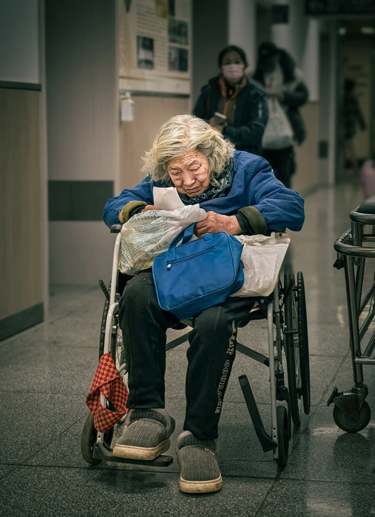 一位腿脚不便的耄耋老人坐着轮椅独自就诊,正查看就诊单据,让我不禁感到孤独和无奈……