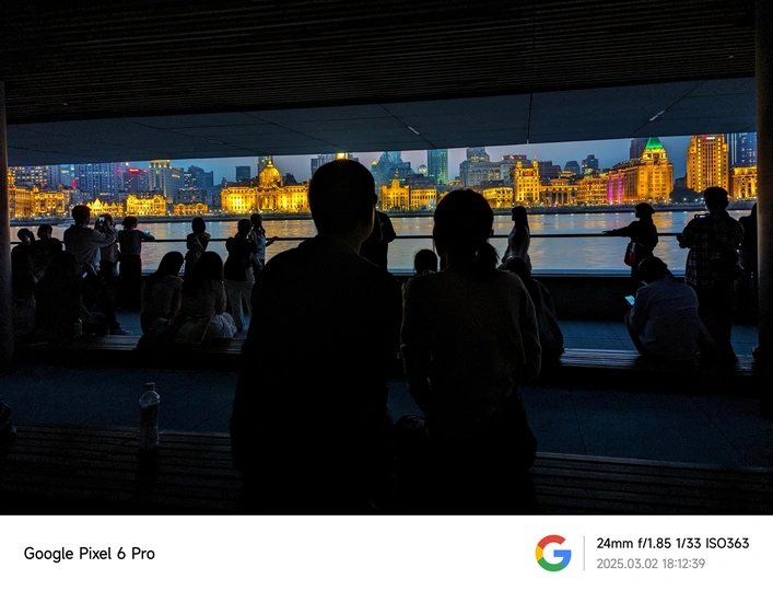 夜晚城市河畔,人群观赏灯光秀。建筑灯火辉煌,河面倒映光华,氛围宁静而美丽。
