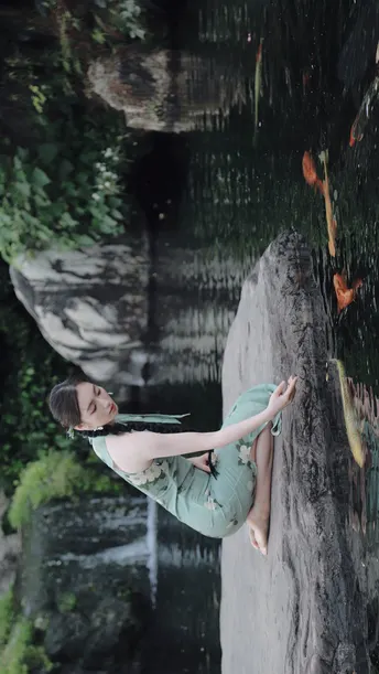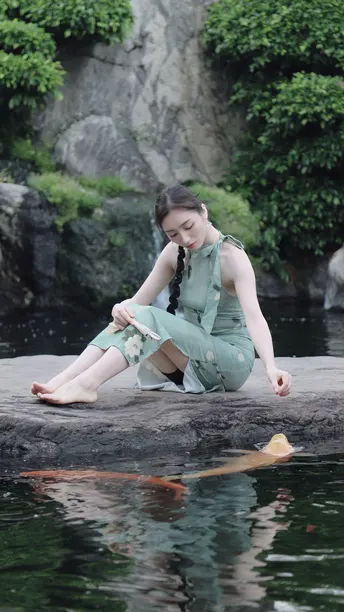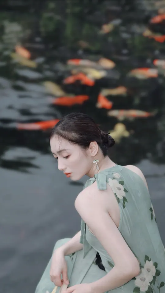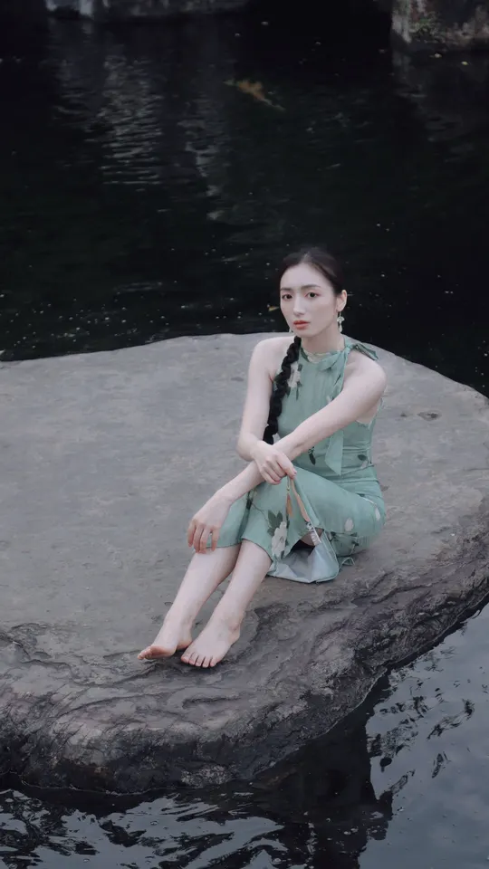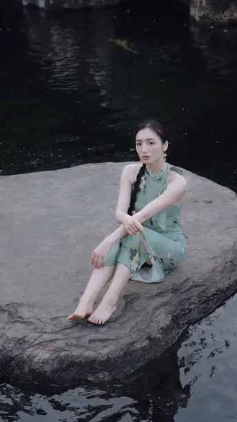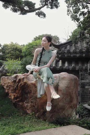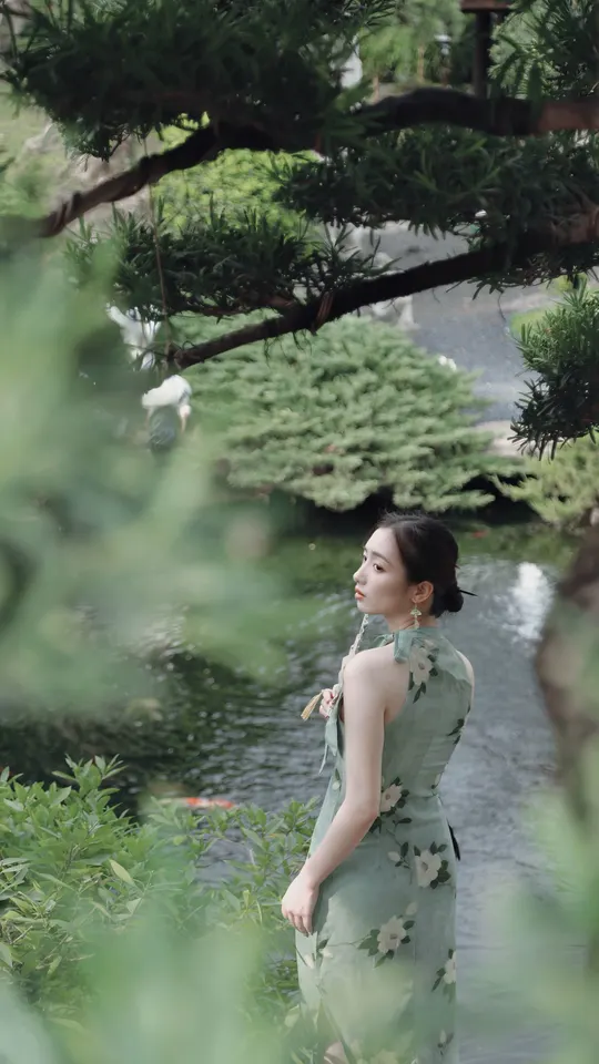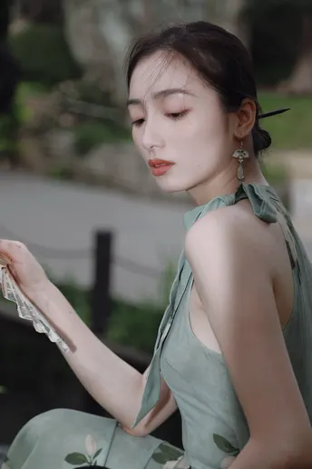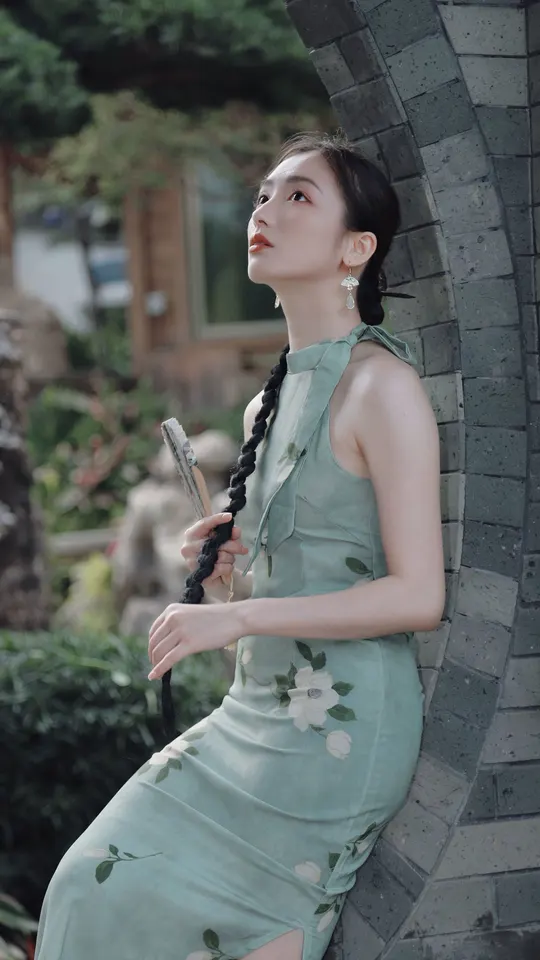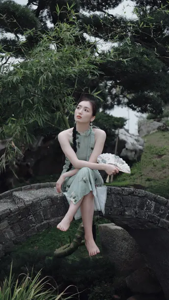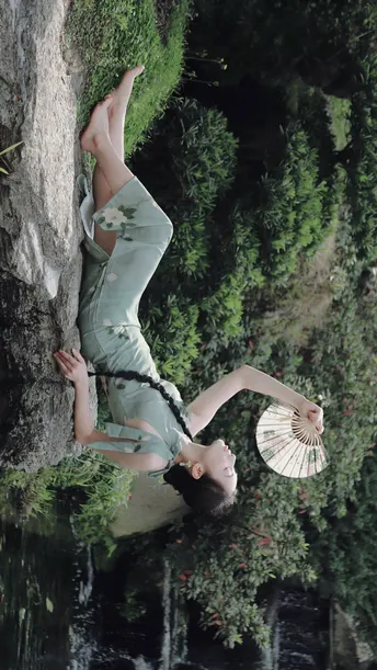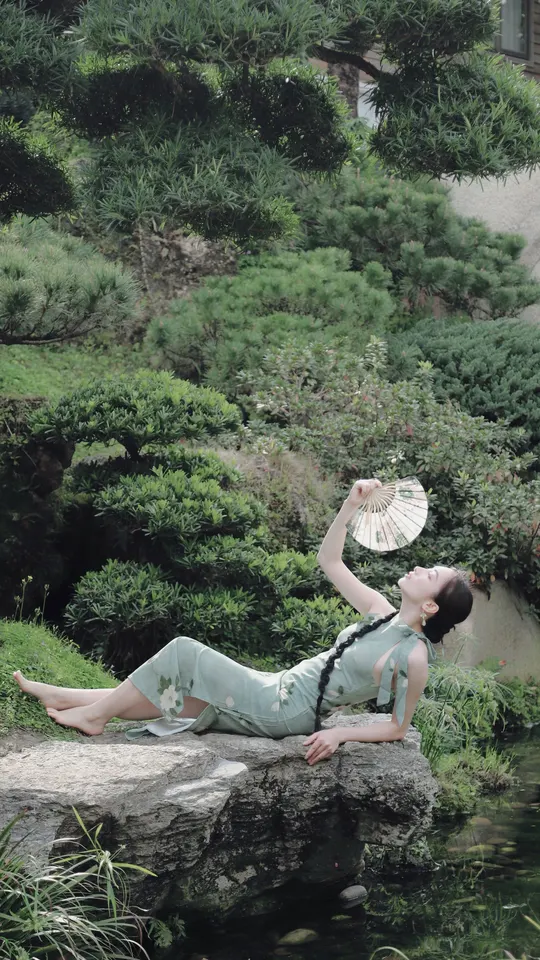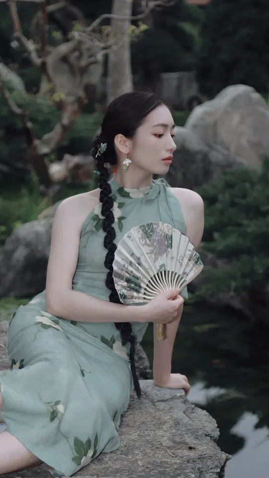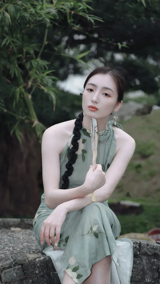 光影泼墨处 一袭浅绿入画来 旗袍的盘扣系住千年韵脚 折扇轻展 便推开一扇江南的窗 青玉色在风中洇染 树影将时光揉成涟漪 你静坐于山水褶皱间 让石阶生长出工笔画的枝条 远山雾霭是未干的水墨 波光粼粼处 暗藏绢帛的呼吸 金属发簪折射月白色诗意 而盘发垂落的弧度 恰似宣纸上将滴未滴的墨痕 不必寻扇面上的题字 风掠过绿纱衣袂时 已替竹林写完半阙宋词 且任镜头蘸取这抹东方青 把浮生裁成可入卷的闲章
