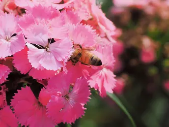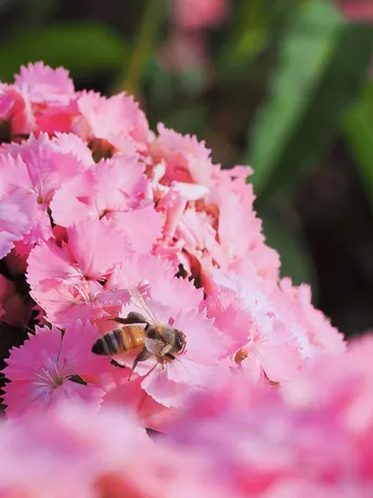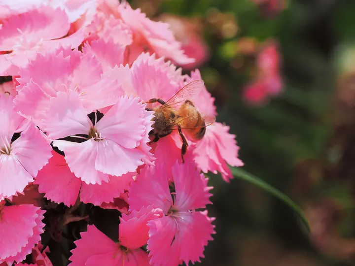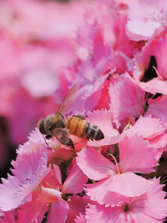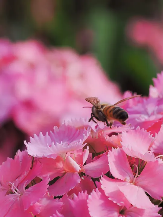 午后阳光淌过须苞石竹的粉色蕾丝裙摆,将花瓣褶皱里的阴影熨成半透明的金箔。蜜蜂钻进绒球般的花芯时,绒毛沾满了晶亮的糖霜,六足交替拨动蕊丝的模样,像在弹奏一架缀满露珠的竖琴。风掠过花丛,那些细密如流苏的苞须簌簌颤动,抖落几粒偷藏在萼片深处的光斑,正巧跌进青草间酣睡的蝴蝶翅膀,溅起一小片虹色的涟漪。