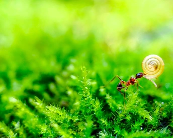 在绿意盎然的苔藓间,蚂蚁背负着精致的螺旋贝壳前行。微小世界里,它似是怀揣梦想的行者,每一步都在丈量勇气,于无声处诉说着坚韧与探索的故事。