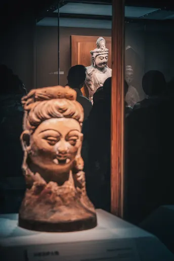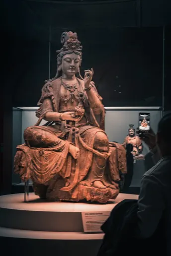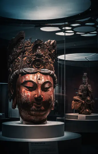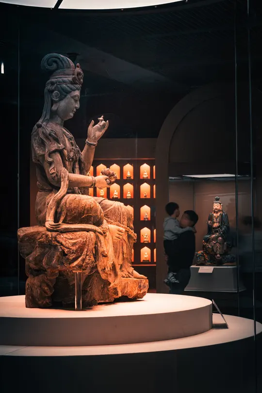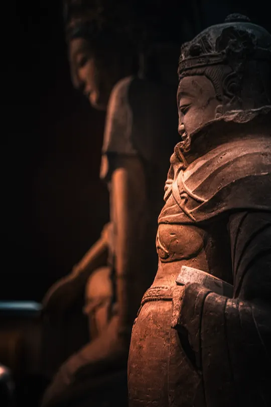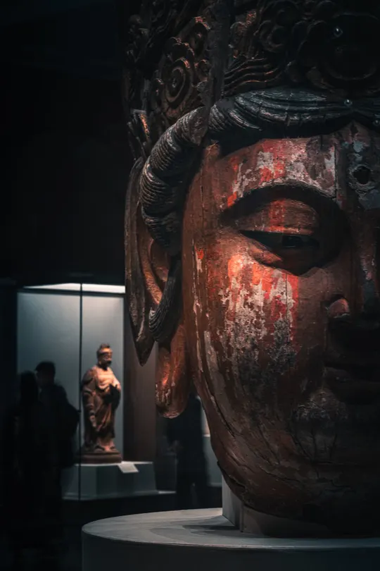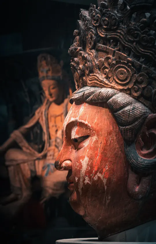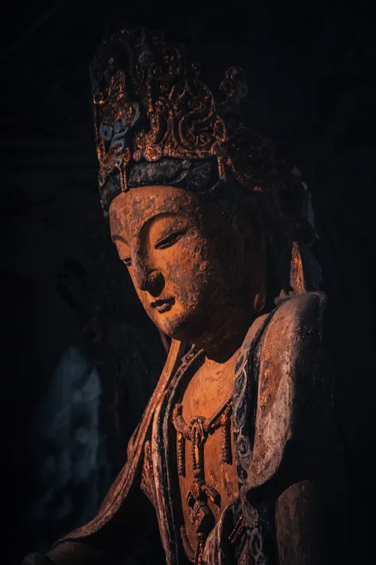 剥落的朱漆,诉说着岁月的风霜;沉静的眉眼,映照出千年的故事。它曾见证王朝的更迭,也聆听过人世的悲欢。在微光中,这双目光似乎跨越了时空,温柔而深邃,凝视着每一个驻足凝望的人。