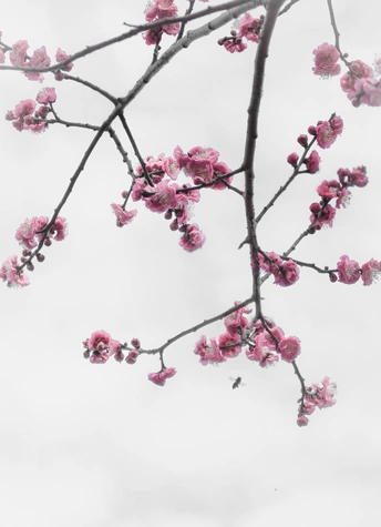 春日里最先开放的是在枝头争先开放的红梅,蜜蜂也忙着采蜜