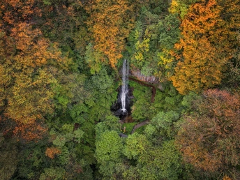 一片斑斓的森林闯入视野,繁茂的树木,叶片被秋色晕染成橙黄、火红,与浓郁的翠绿交织,似大自然打翻了调色盘。一条灵动的瀑布从中垂下,如银练般闪耀,旁边蜿蜒的小径仿佛在邀请人们踏入这如诗如画的秘境