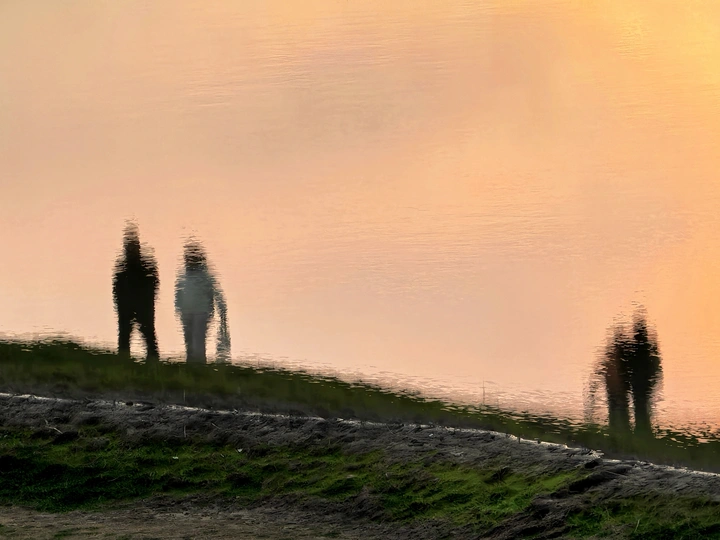河岸边的小道上,两对爱人在散步谈心,水面上的倒影像毛玻璃一样,借着夕阳下的暖色,这一刻,无与伦比。