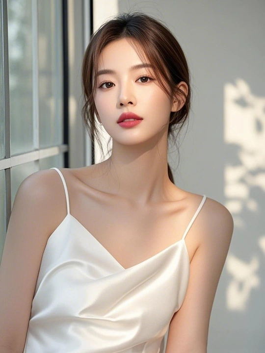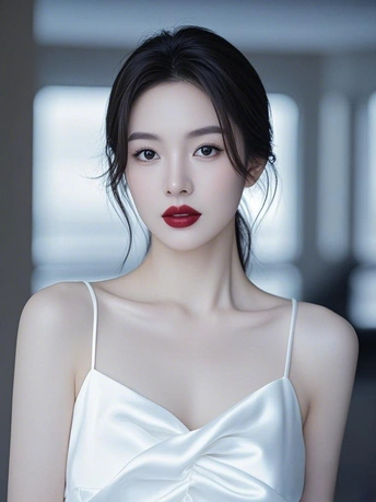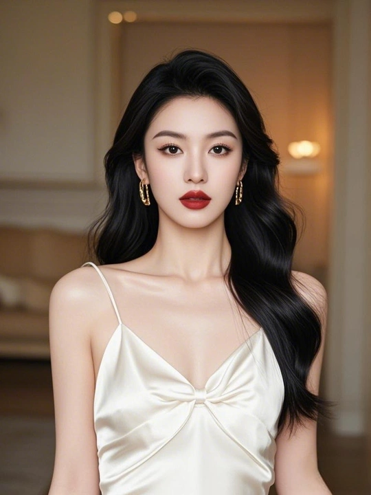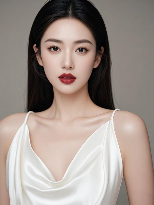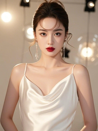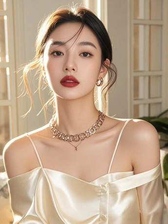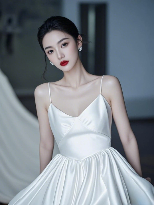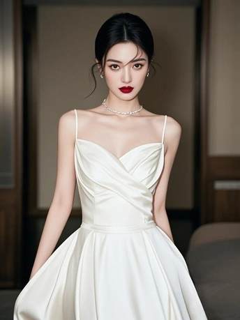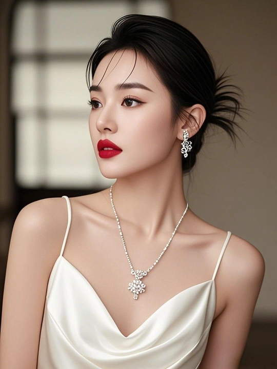 《韵致华光》 素裳轻漾映娇容, 璀璨珠玑映颈胸 。 唇点朱红添雅韵, 眸光流盼意无穷 。