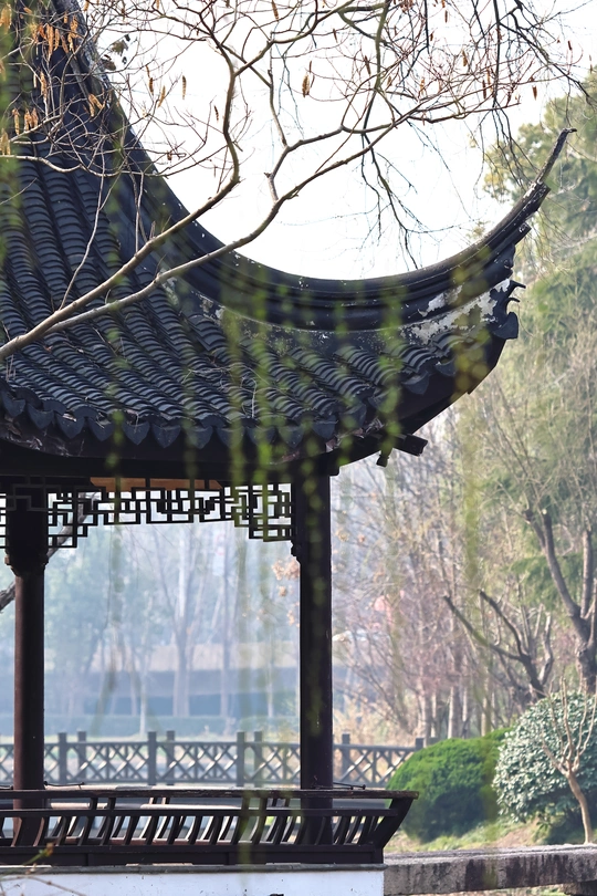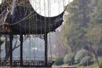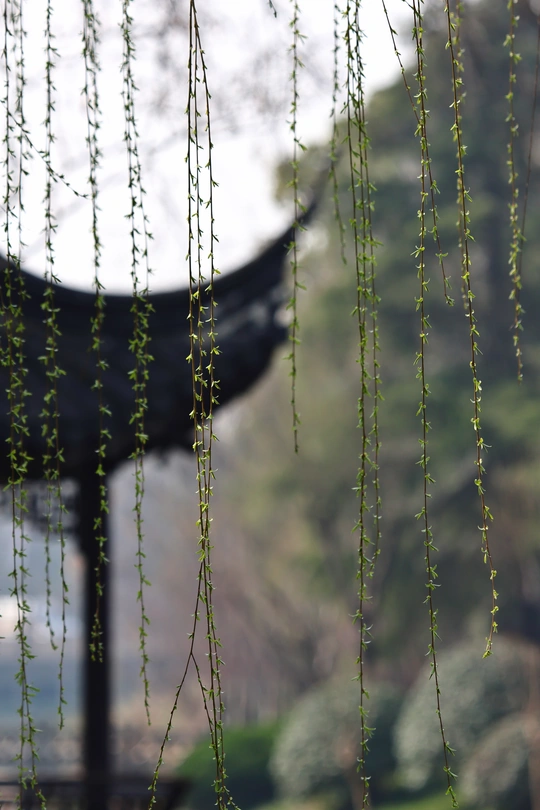 公园里一处亭子,旁边的柳树垂下绿色丝绦,亭子一直在那里看着枝条黄了又绿,人却随着时间的流逝慢慢老去