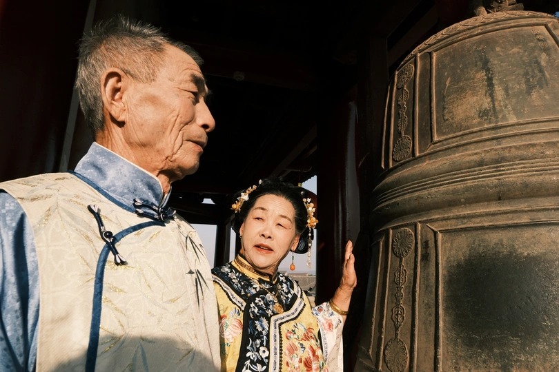 这张暖色调的照片捕捉了一对穿着古装的爷爷奶奶在鼓楼大钟前的温馨瞬间。爷爷目光坚定地望向前方,仿佛在回忆往昔的岁月;而奶奶则微微侧头,带着一丝羞涩的笑容注视着爷爷,手中轻轻扶着古老的钟楼大钟。背景中的钟楼与古装服饰交相辉映,仿佛将时光拉回了过去,展现了岁月沉淀下的深情与默契。钟声仿佛在耳边回荡,伴随着奶奶的笑颜,传递出温暖与幸福的气息。这张照片不仅记录了爷爷奶奶之间的情感,也让人感受到传统文化与时光交织的美好。