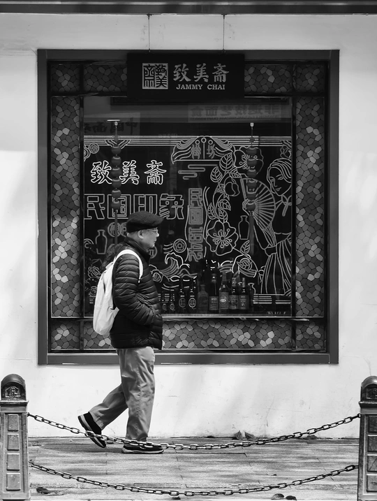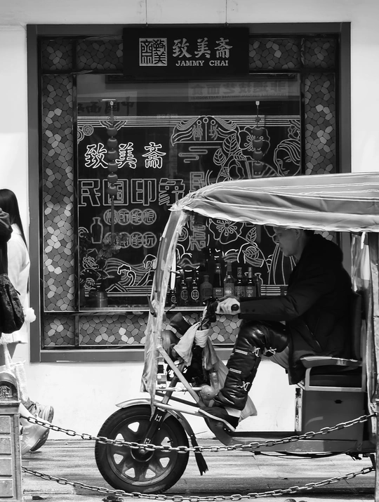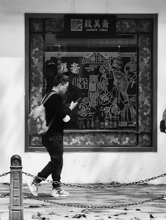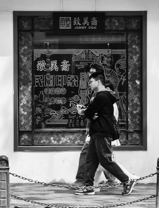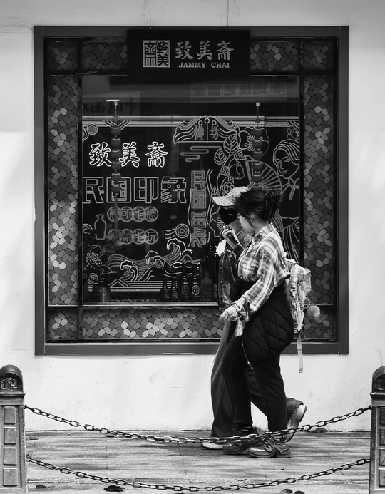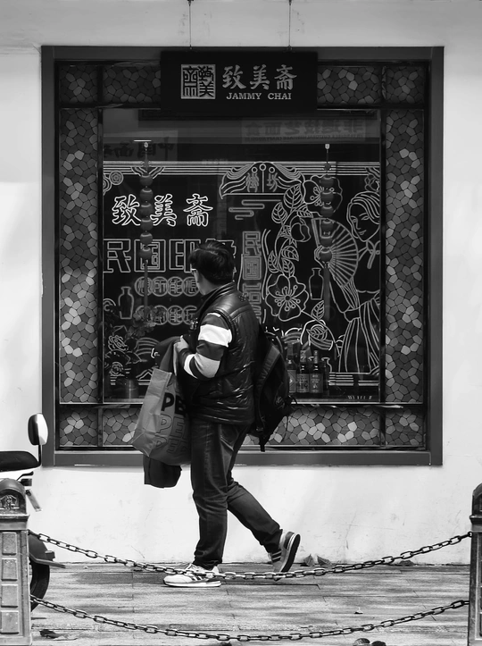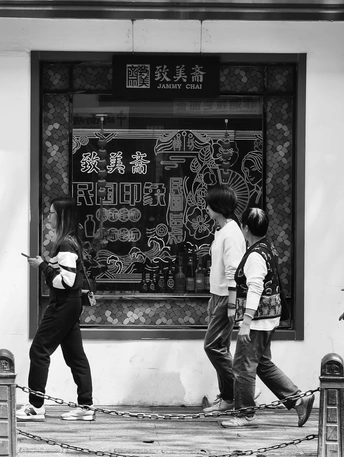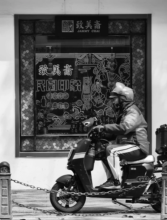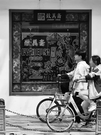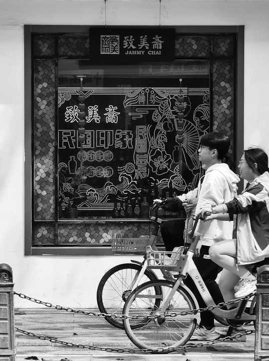 致美斋前,时光仿佛慢了下来。不同的行人匆匆而过,有人骑行奔赴,有人并肩相伴,有人低头沉思,每一个身影,都诉说着属于自己的故事 。