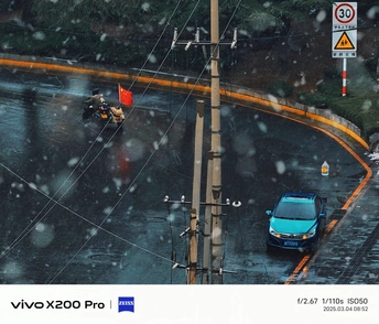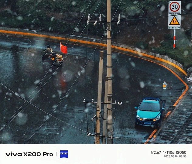 在这个雨夹雪的初春早晨,雪花轻轻飘落,触地便悄然融化。街上几乎看不到行人的身影,只有偶尔驶过的摩托车划破寂静。路边停放的车辆也被一层薄雾笼罩,整个城市有了一种特别的宁静与美好。