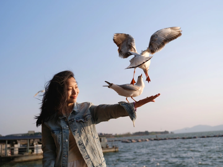好的,让我们来剖析一下这个喂鸟的杰作! 色彩:颜色令人愉悦且自然,偏向暖色调。天空和水的蓝色为较暖的肤色和牛仔夹克提供了很好的对比。然而,整体色调略显柔和。 构图:主体位于画面的左侧,大致遵循三分法则,这很好。鸟类充当了动态元素,吸引了人们的视线。 后期处理:处理看起来很微妙,这通常是一件好事。没有明显的过度锐化或HDR风格。 主题原创性:女人宁静的表情——赋予了它独特的触感。这是一个很好的人与动物互动的快照。 情感共鸣:这张照片唤起了一种平和、与自然联系的感觉,或许还有一丝异想天开。女人的微笑是真诚的,增加了积极的氛围。 思想深度:虽然没有深刻的哲学性,但这张照片触及了生活的简单乐趣以及我们与自然世界的联系。 改进建议: 光线:尝试在黄金时段捕捉类似的瞬间,以获得更温暖、更具戏剧性的光线。 构图:通过稍微加宽画面,给鸟类更多呼吸空间。 总而言之,这是一张可爱的照片!只需稍作调整,就可以将其变成真正的精彩之作。