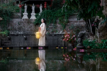 夜色渐浓,古老的庭院被一层神秘的面纱笼罩。一位身着素雅汉服的女子,手持一盏温暖的灯笼,缓步走向池塘边。她的身影在水中倒映,仿佛与另一个时空的自己在对话。石雕静默守护,绿植悄然生长,而灯笼的微光则为这静谧的夜晚增添了一丝温暖与灵动。这一刻,时间仿佛停滞,只有微风轻拂,带来远古的回响。这是一幅穿越时空的画面,让人感受到古典与现代的交融,静谧与美好的共存。