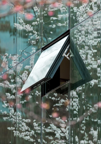 玻璃幕墙似画布,打开的窗如灵动笔触。李花烂漫,粉白与翠绿交织,光影摇曳,不经意间,便拍到了这印象派般的梦幻景致 。