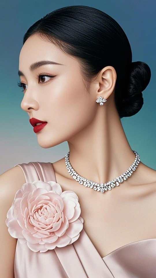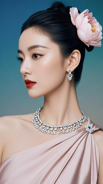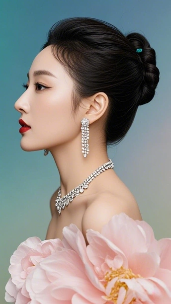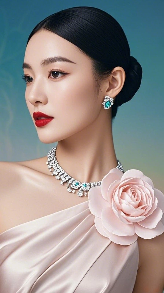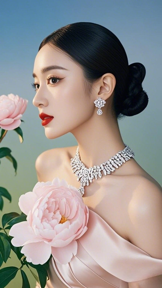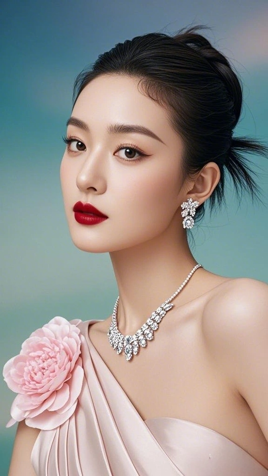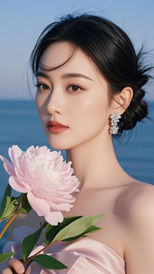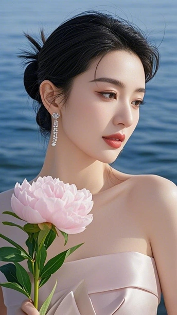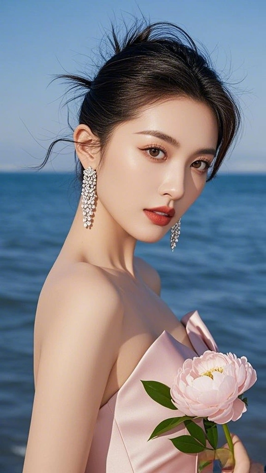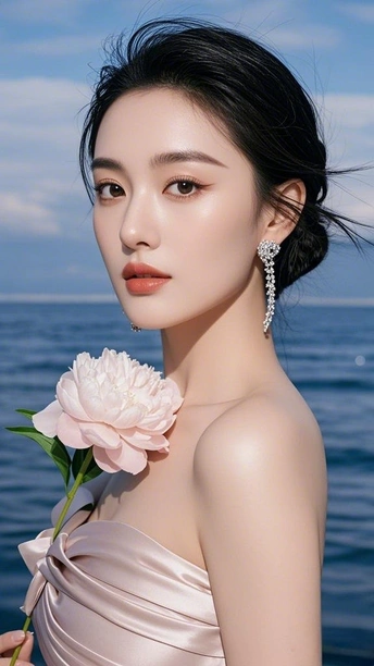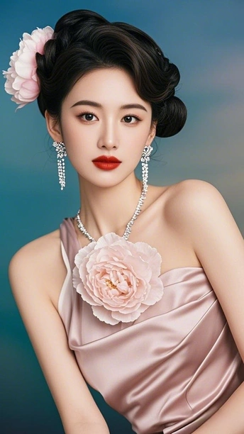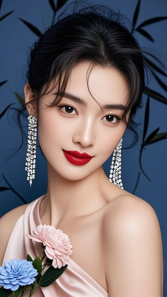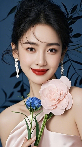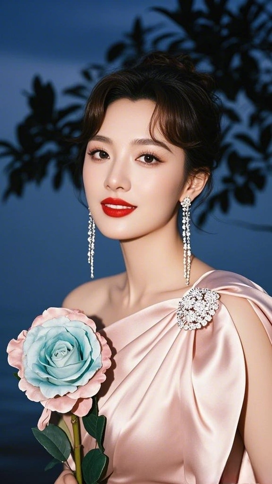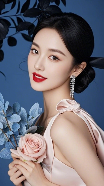 光影间的凝眸 在蓝调的背景里 她,似一首优雅的旋律 发间的黑绸轻挽 挽起岁月的温柔与神秘 耳坠闪烁如星子 点亮眸光里的深邃 那一抹红唇似火 燃烧着无声的魅惑与热烈 手中的玫瑰与叶 交织着梦幻与真实 浅粉与蓝绿的碰撞 是心底诗意的流淌 每一处线条,每一道光影 勾勒出独属的风情 在时光的画布上 她是永不褪色的风景