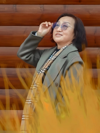 在南部山区大门牙朋友的酒庄,以黄叶为前景,拍摄了木屋前的女子,表现人物的神态表情及肢体动作。