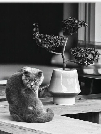 在宁静的午后,一只小猫与它的绿色伙伴共享片刻安宁。