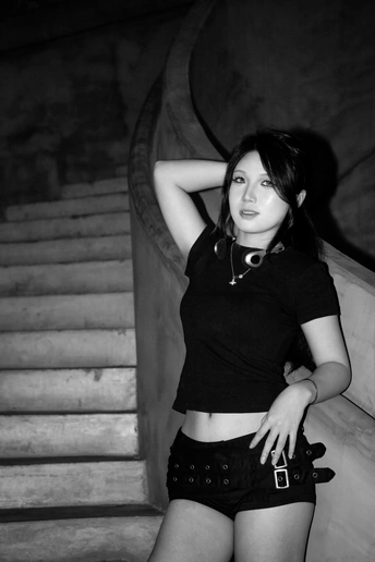 工业风的楼梯,配上个性简约的黑色穿搭,不需要巨大的颜色冲击,拍出神秘高级的感觉