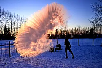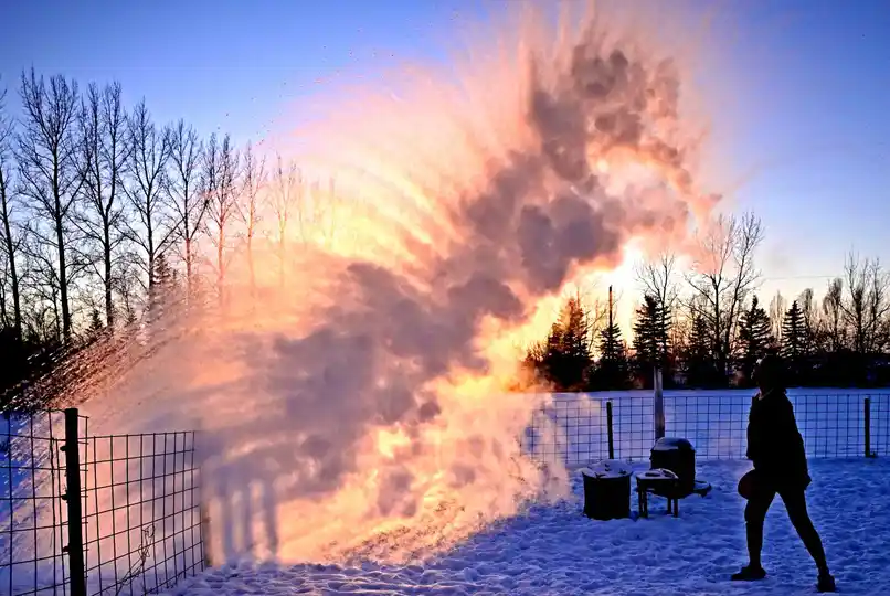在加拿大时,整个大地被白雪覆盖,气温在零下20多摄氏度,天气非常冷,我们好奇,在家烧一壶开水拿到外面雪地上泼向天空中形成了这个现状