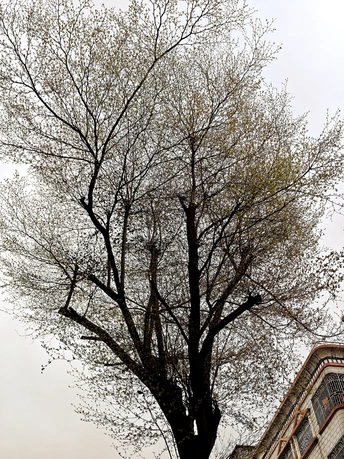 小区的树枝茂密的小叶子盛开,象征着春天的朝气蓬勃,空气中都弥漫着绿色清香。