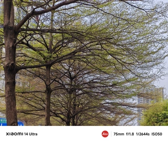 马路边的树枝茂密的小叶子盛开,象征着春天的朝气蓬勃,空气中都弥漫着绿色清香。