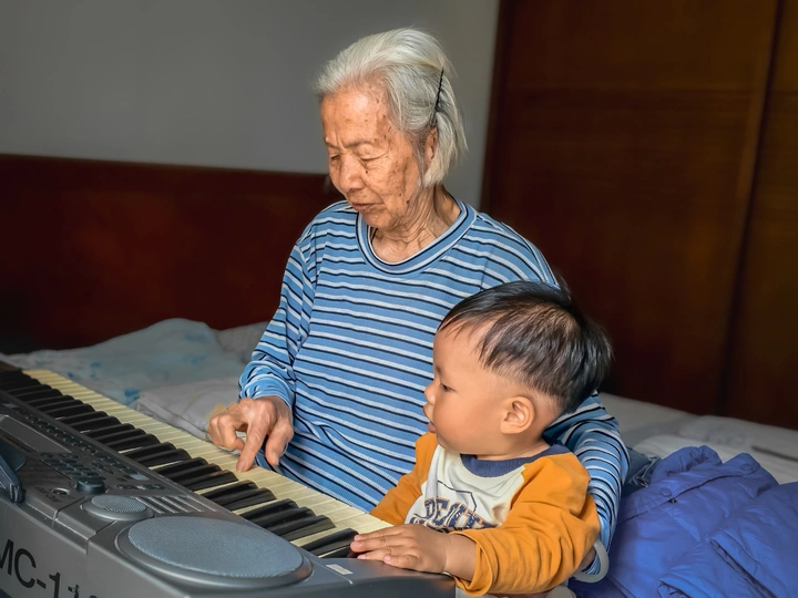 九十二岁的祖奶奶在教一岁的小孙孙弹琴,祖奶奶教的认真,小孙孙也学的认真,画面既美好又温馨。