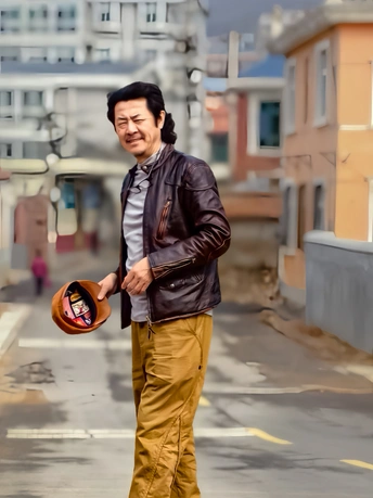 在南部山区的路口,抓拍了画家回头的一瞬间,表现了人物的神态表情及气质。