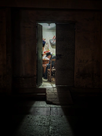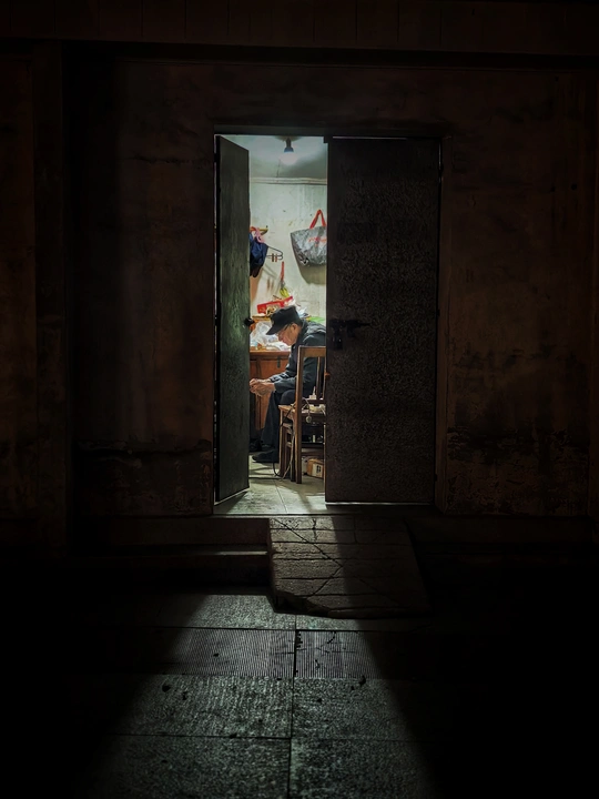 #祎璠纪实# #手机365-2063# 昏黄灯光下,老人独坐屋内。门外暗影深沉,仿佛隔绝出两个世界。那一抹从屋内溢出的暖光,藏着岁月的故事,也有着不为人知的宁静与孤单 。
