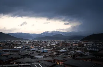 古城被雪山环抱中间,远处的霞光洒在房屋上,光影错落有致