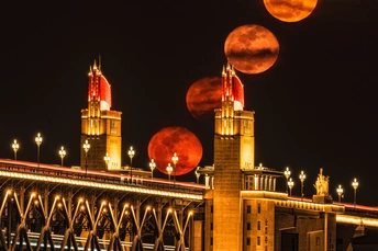 三月的南京,经历了一大波阴雨天气后终于是放晴了,只可惜晚了一天,错过了十五十六的满月。 下午拍完河西金鹰的悬日后,和大哥分别,他去拍了紫峰的悬月,效果非常好,我有点后悔没跟着他了。回家吃完晚饭,我已经来不及了,只能去试试桥头堡。 这次看地图找位置还是偏差了很多,导致血月升起后我才发现。赶紧抱着三脚架移动,才勉强补救,差一点又白挨冻一晚了。唯一可惜的是,机位有点近,撑不满桥头堡。