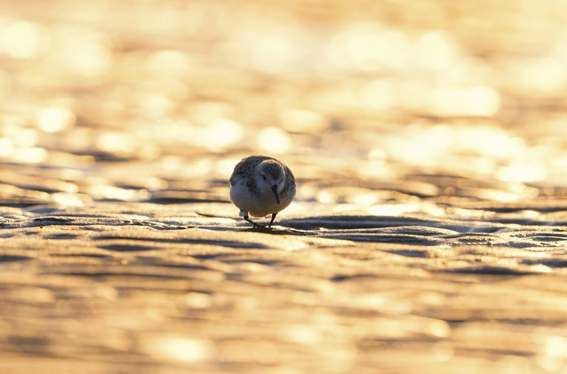 金色夕阳下一只戴黑白脚旗,崇明岛环志的三趾滨鹬。