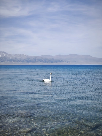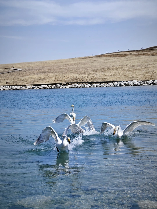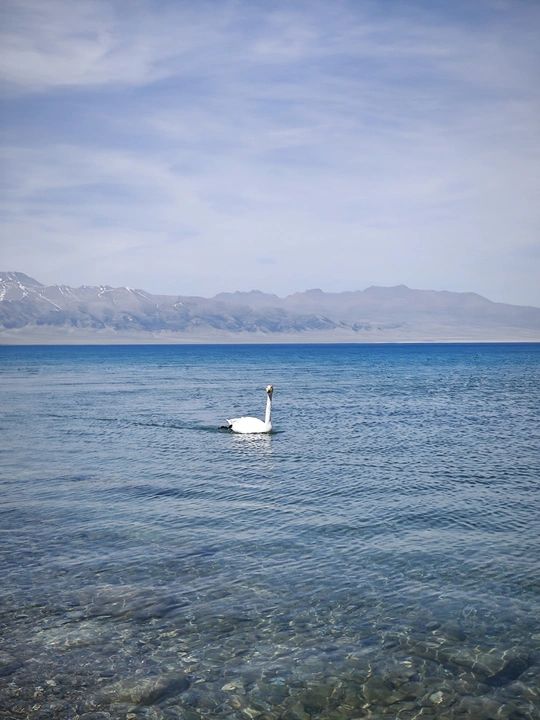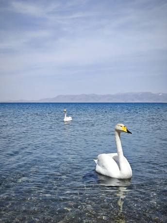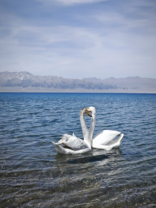 蓝湖似梦,铺展在天地间, 天鹅成双,是梦里的诗篇。 它们相依,在澄澈的水波上, 脖颈交织,似在编织爱的花环。 远处雪山沉默,见证这浪漫一刻, 云朵悠悠,也为这深情停泊。 每一次轻触,每一个眼神交汇, 都诉说着永不褪色的承诺 。