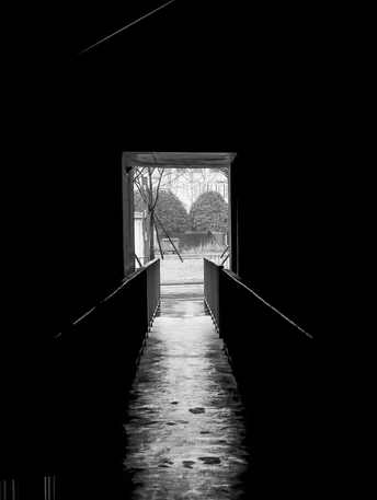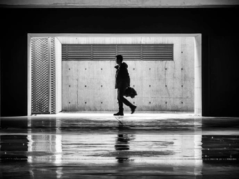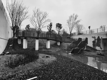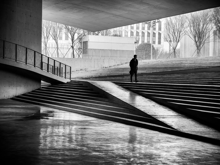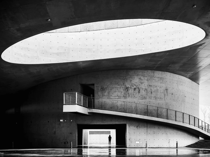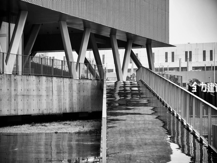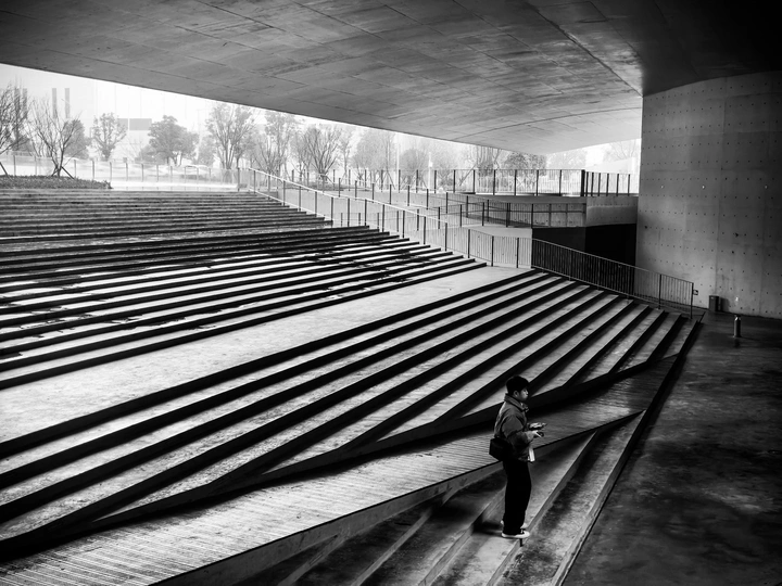 初春阴雨绵绵的午间十分,数字空间站棱角分明的几何体量在地面投下浓墨般的阴影。一位中年男人踩着旧皮鞋,时而在中庭抬头仰望天空,时而沿着建筑周围不停踱步,远远的观望,虽然不能听到他嘴里的之言碎语,但是分明可以深切的感受到他内心的焦躁与不安。他垂首摩挲着烟蒂,影子被斜切的水泥挑檐割裂成碎片。这座由参数化算法生成的建筑正吞吐着数据洪流,却吞没了最后一声叹息。掏出相机用快门记录下这永恒的黑白困局。