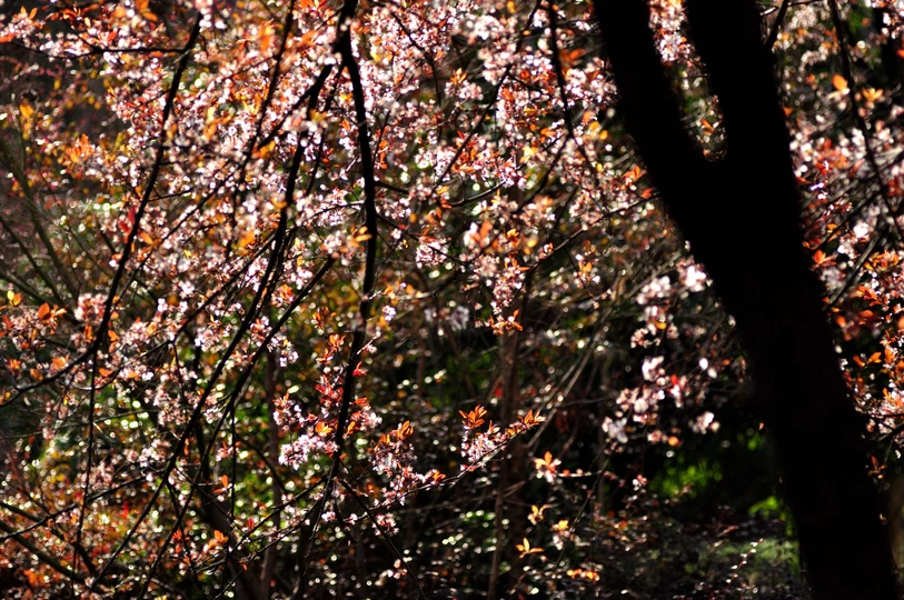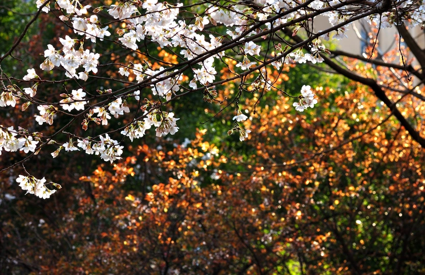 小区内的樱花、海棠(西府海棠、垂丝海棠)、桃花竞相开放,酷似在演奏春的交响曲。